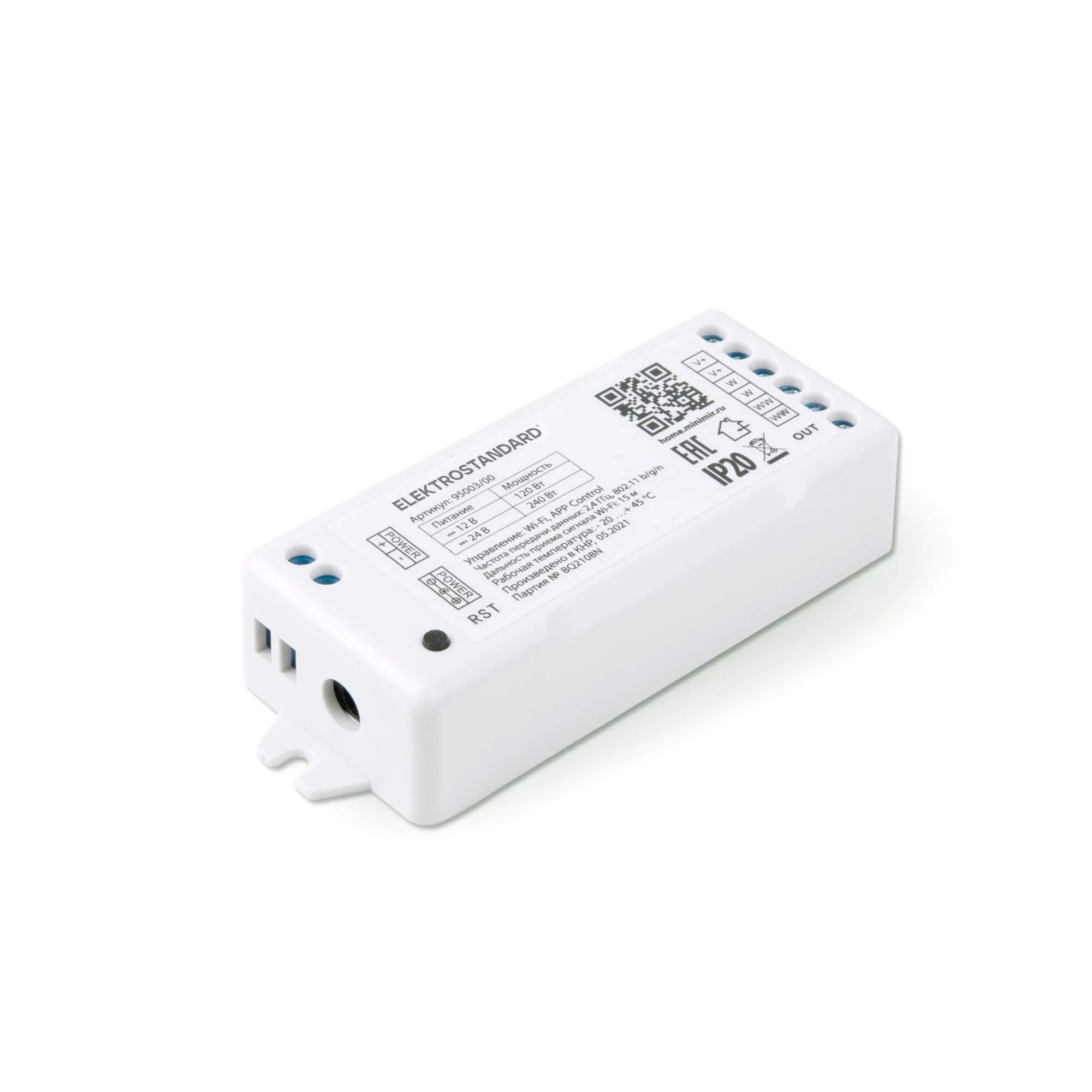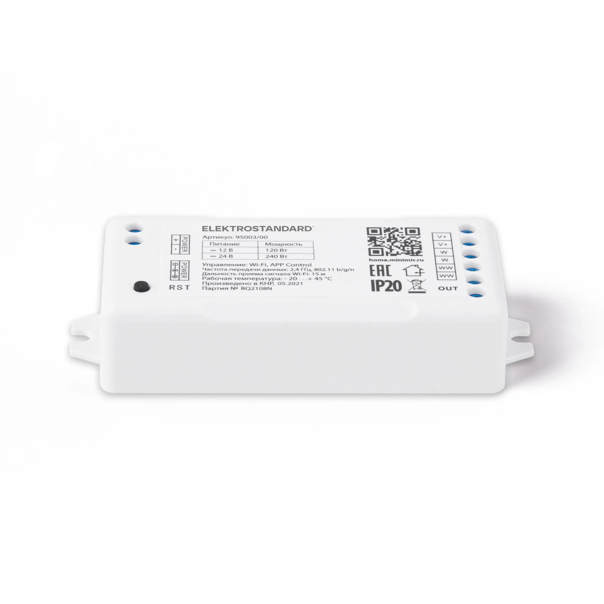 Артикул: 95003/00; Бренд: Elektrostandard; Серия: Аксессуары для светодиодных лент 12/24V; Степень защиты: IP20; Выходное напряжение, V: DC 12/24; Электромагнитная совместимость: Нет; Температурный режим: -20 ... +40; Срок службы светодиодов, ч: 15000; Материал: Пластик; Цвет: белый; Умный дом: встроен; Гарантия, мес: 24; Длина, мм: 100; Ширина, мм: 38.6; высота: 21.2