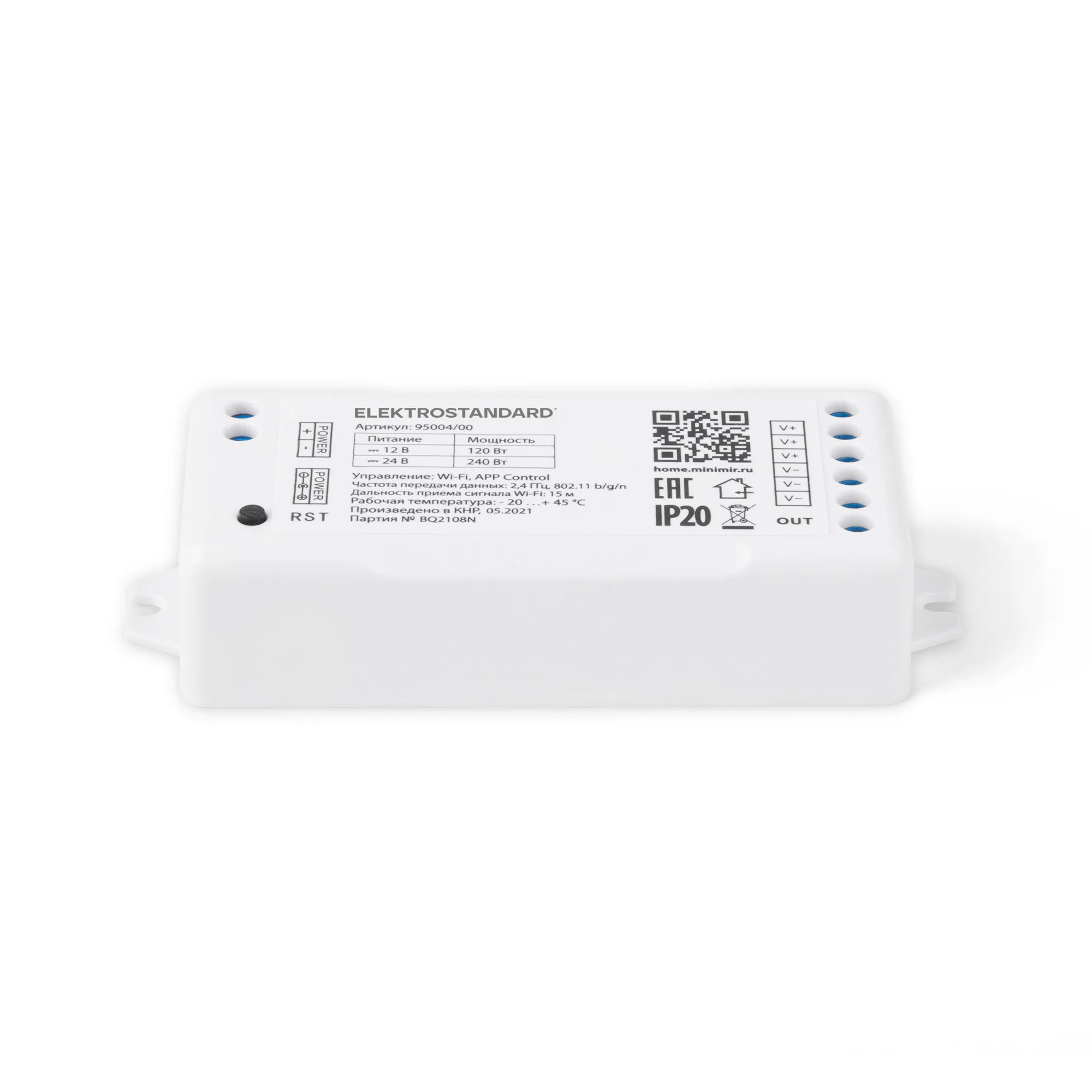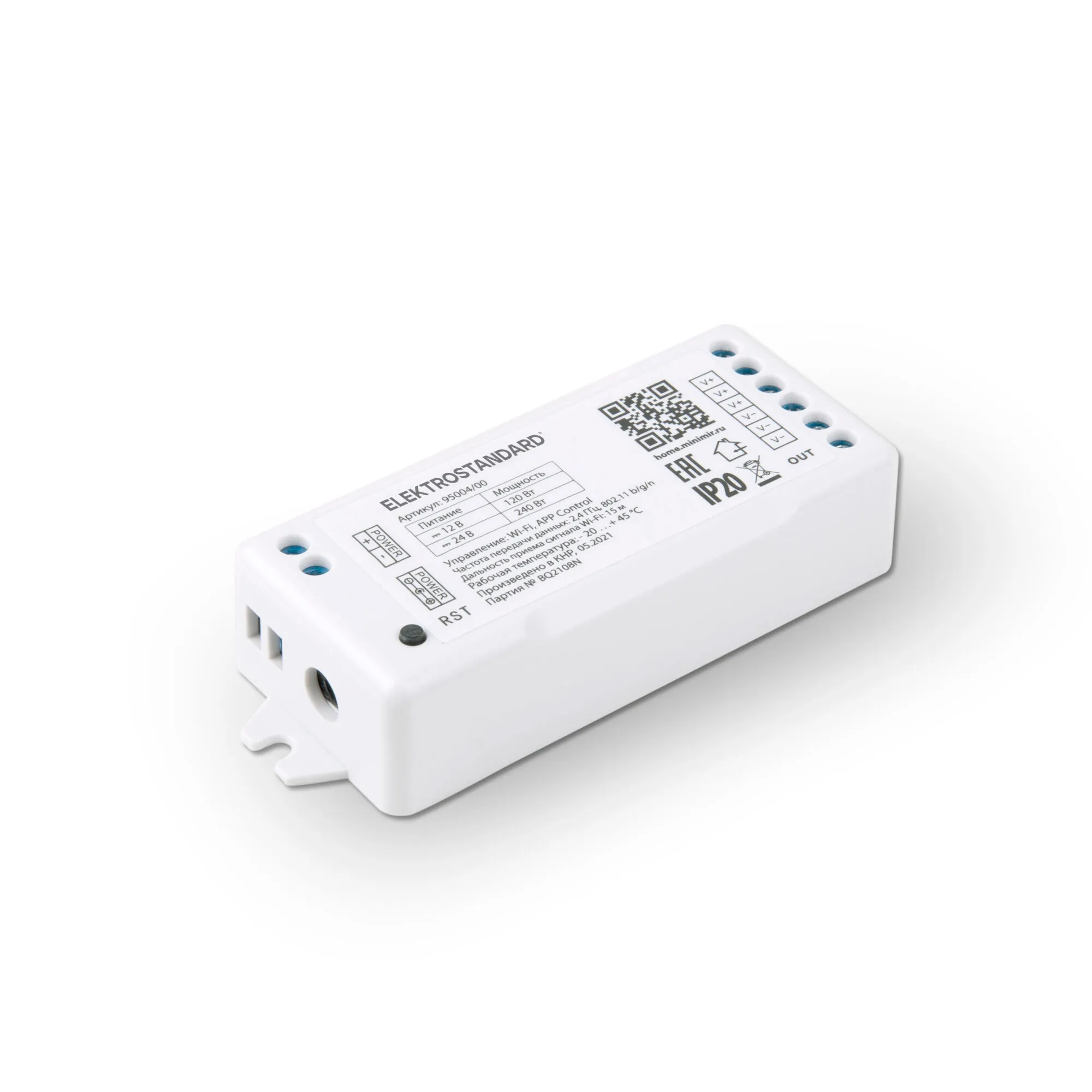 Артикул: 95004/00; Бренд: Elektrostandard; Серия: Аксессуары для светодиодных лент 12/24V; Степень защиты: IP20; Выходное напряжение, V: DC 12/24; Электромагнитная совместимость: Нет; Температурный режим: -20 ... +40; Срок службы светодиодов, ч: 15000; Материал: Пластик; Цвет: белый; Умный дом: встроен; Гарантия, мес: 24; Длина, мм: 100; Ширина, мм: 38.6; высота: 21.2